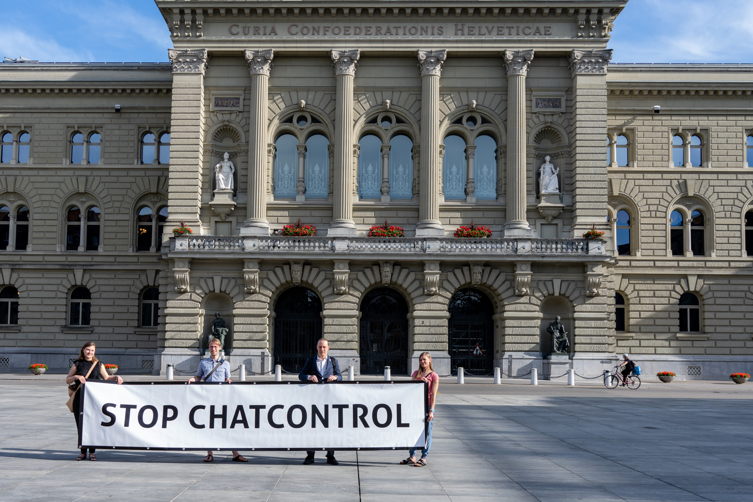 Die Piratenpartei hat gestern eine Protestaktion in Bern auf dem Bundesplatz und vor der Delegation der Europäischen Union gegen die Chatkontrolle durchgeführt. Eine Demobewilligung hatte die Stadt vorab verweigert. Die Bilder finden Sie unter dem offenen Brief.